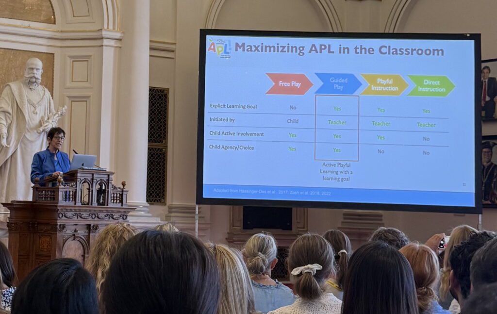 På årets EARLI-konferens lyfte professor Kathy Hirsh-Pasek (Temple University) fram att aktiv vägledd lek (Active Playful Learning) – till skillnad från fri lek och i jämförelse med direkt undervisning (direct instruction) – ger de bästa förutsättningarna för barns kunskapsutveckling.